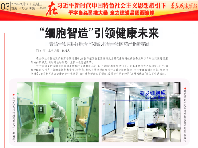 近日,山东泰鸿生物科技发展有限公司“细胞技术服务标准化试点”,成功入选青岛市2025年度“10+1”创新型产业体系领域标准化试点项目计划。